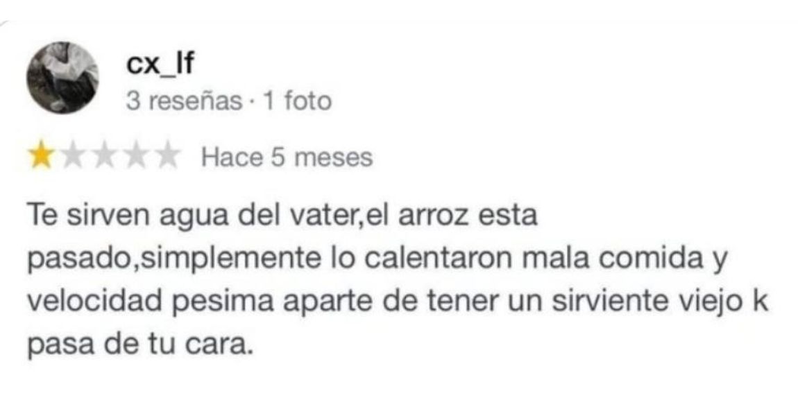 Todo empezó cuando el cliente publicó su opinión en una plataforma de reseñas online, donde calificó al restaurante de pésimo. Según él, le sirvieron “agua del váter”, el arroz estaba pasado, la comida era mala y el servicio lento. Además, se refirió al camarero con un despectivo e innecesario término de ‘sirviente viejo, que es una palabra mucho más despreciativa que trabajador o camarero.