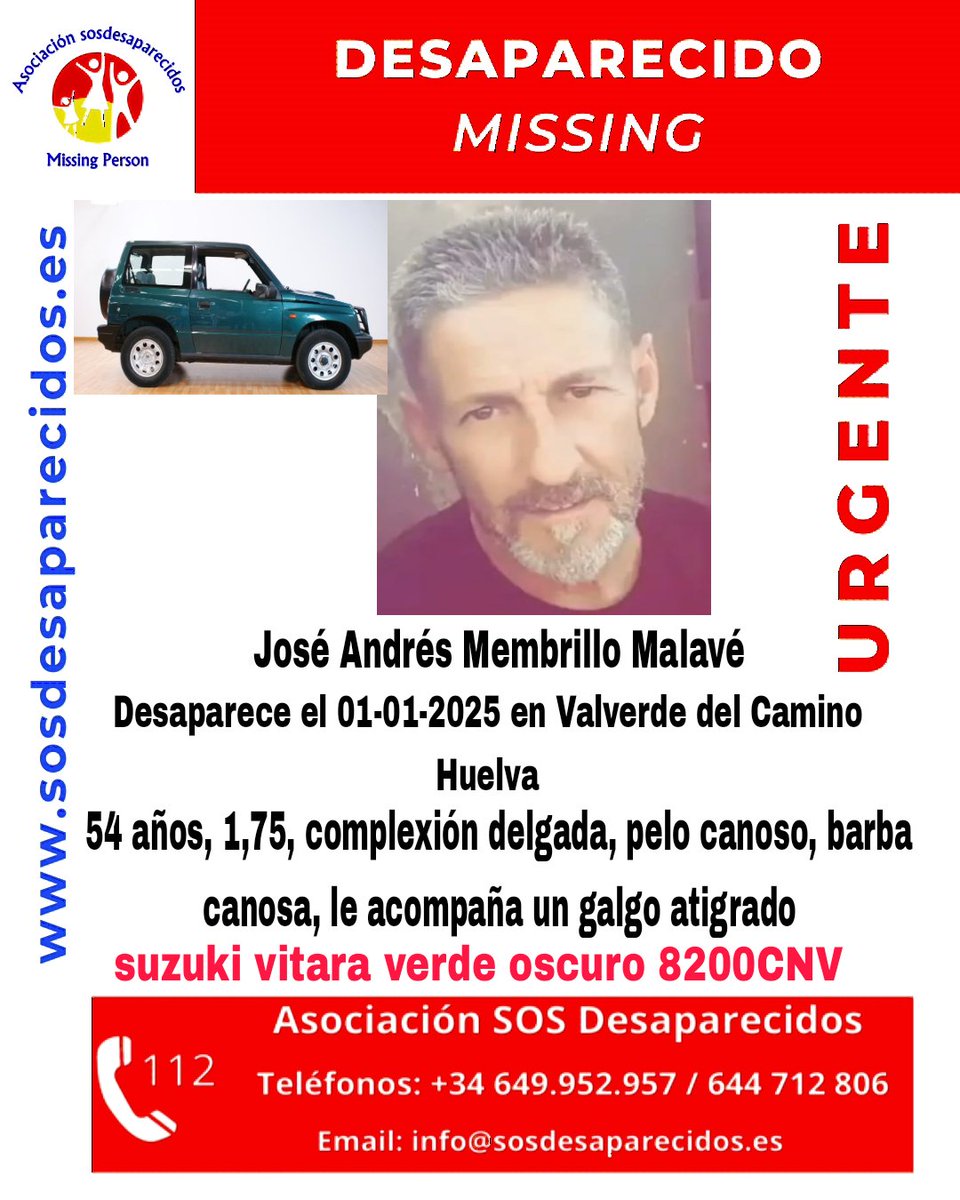 Mientras tanto, la búsqueda sigue activa en Valverde del Camino y sus alrededores, con especial atención a zonas rurales o caminos poco transitados. La presencia del perro galgo atigrado y el distintivo vehículo 4×4 son elementos que pueden facilitar la localización de José Andrés, cuya familia espera noticias con creciente preocupación.